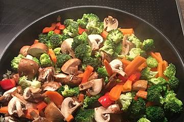 Etwas Öl in einer Pfanne erhitzen. Möhre, Knoblauch, Paprika und Brokkoli bei mittlerer Hitze ca. 5 Min. dünsten. Champignons, Curry und Harissa zugeben und mit Salz und Pfeffer würzen. Die Brühe zugießen aufkochen und kurz köcheln lassen.