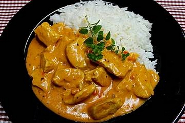 Im zerlassenen Fett die Putenbruststreifen anbraten. Zwiebeln zufügen, mitdünsten. Pfeffern, salzen. Mehl, Curry, Tomatenmark zufügen und kurz mitschwitzen. Mit der Hühnerbrühe ablöschen und 10 Min. köcheln lassen. Crème fraîche und Joghurt miterhitzen.