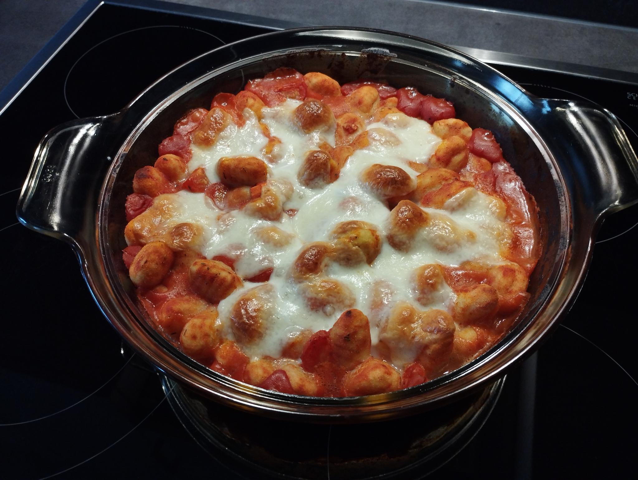 - Gnocchi ungekocht in eine Auflaufform geben. Tomaten halbieren und zu den Gnocchi geben.