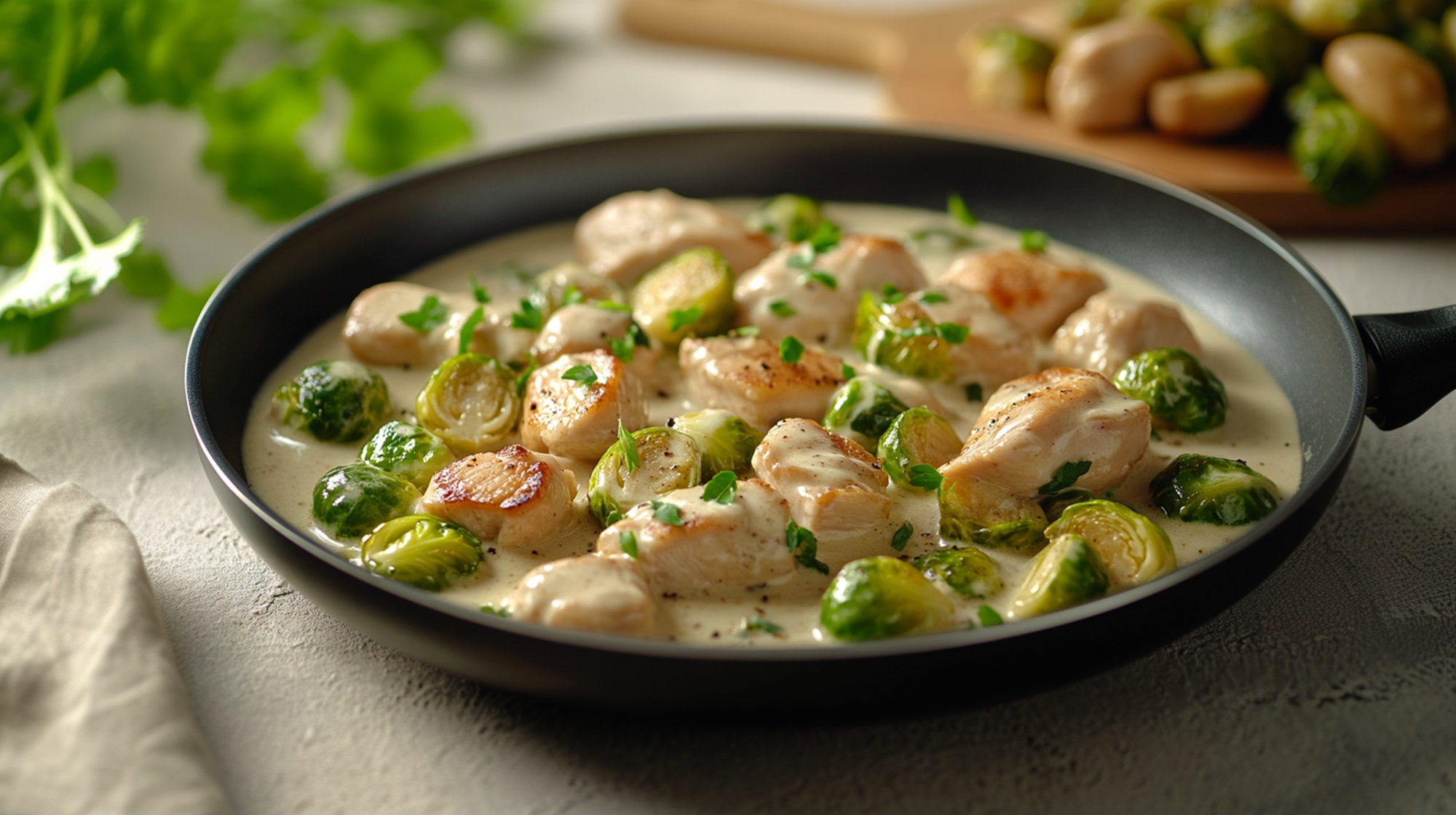 Wasche den Rosenkohl, entferne die äußeren Blätter und halbiere die Röschen. Schneide die Hähnchenbrustfilets in feine Streifen. Ziehe Zwiebel und Knoblauch ab und schneide beides in feine Würfel.