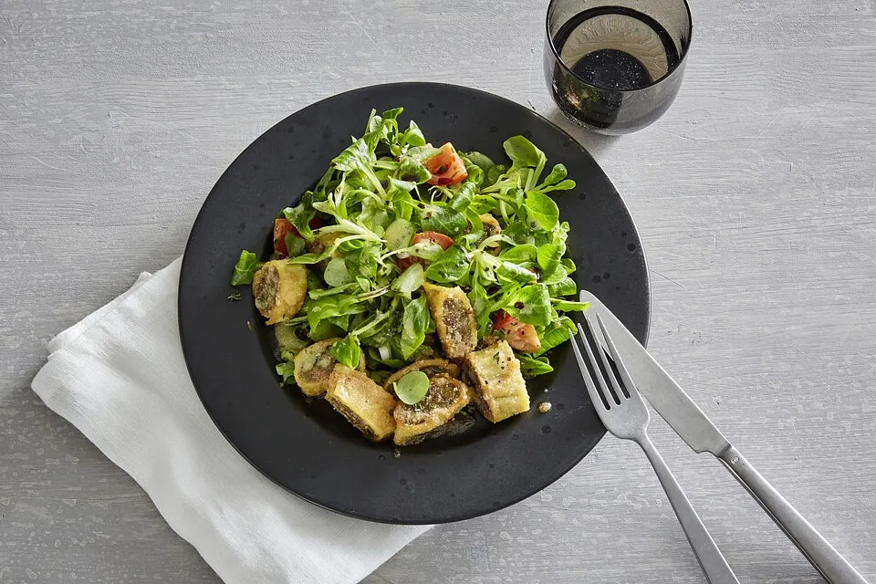 Tomaten, Feldsalat und Frühlingszwiebeln in einer Schüssel mischen und mit einem Dressing aus Senf, Essig, Öl, Salz und Pfeffer beträufeln. Wenn vorhanden, frische Kräuter darüber streuen.