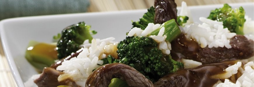 1 EL Öl in einer großen Pfanne oder im Wok erhitzen. Das Fleisch zugeben, alles ca. 1 Minute lang unter ständigem Rühren scharf anbraten, dann aus der Pfanne nehmen. Das restliche Öl in der gleichen Pfanne oder dem Wok erhitzen. Brokkolistiel und -röschen sowie die Zwiebel hinzugeben und so lange unter Rühren anbraten bis das Gemüse „al dente“ ist. Fleisch und Sojasauce-Stärke-Mix dazugeben und zum Kochen bringen. So lange köcheln lassen bis die Sauce dickflüssig ist. Sofort mit heißem Reis servieren.