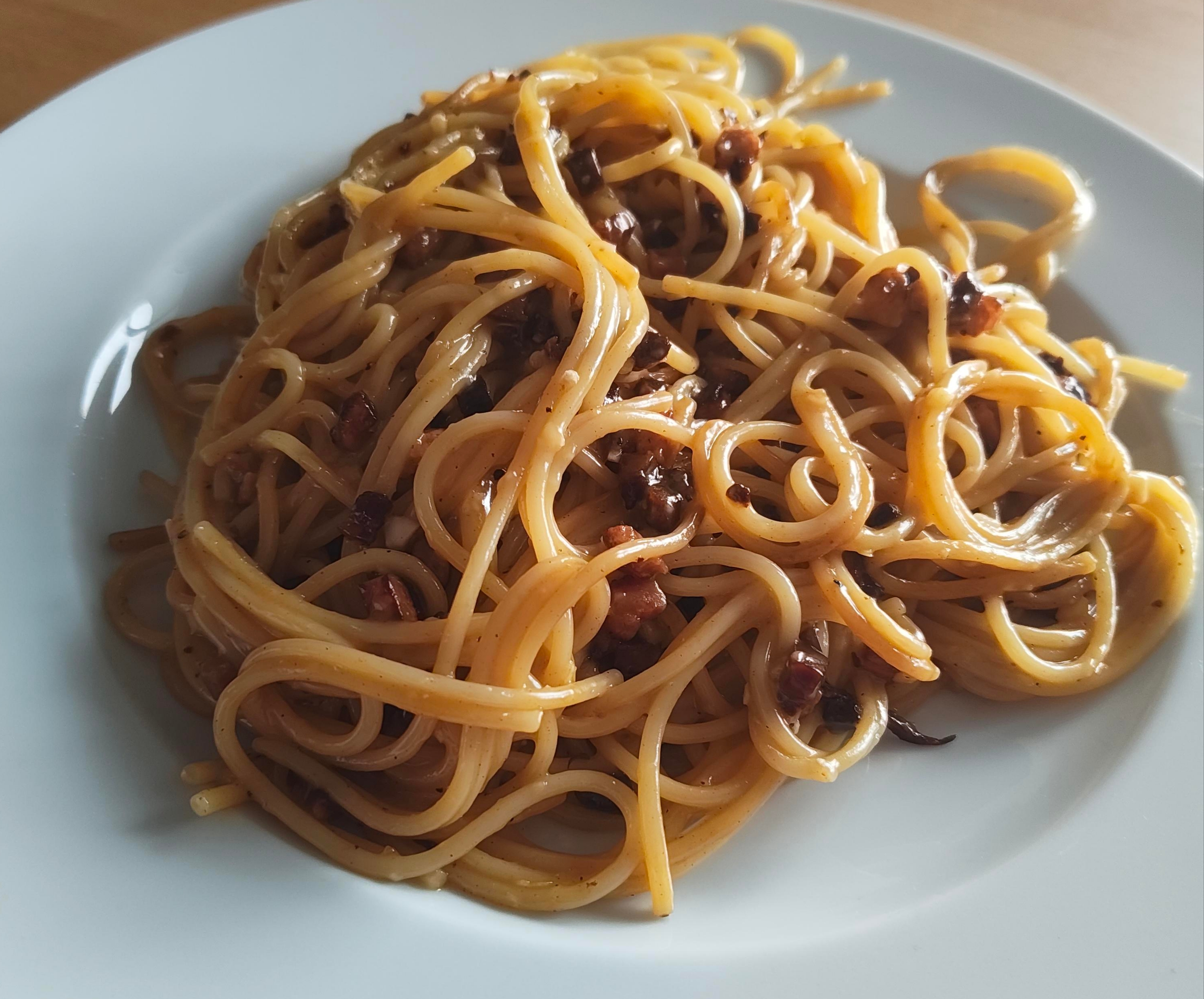Den Speck in einer großen Pfanne knusprig anbraten. Die gekochten Spaghetti direkt aus dem Topf in die Pfanne geben und gut vermengen. Den gehackten Knoblauch hinzufügen und kurz mitbraten (nicht zu lange, damit er nicht bitter wird). Pfanne vom Herd nehmen, die Ei-Parmesan-Mischung und etwas vom Kochwasser unterrühren. Alles zügig mischen, bis die Soße schön cremig ist – sie darf nicht stocken.