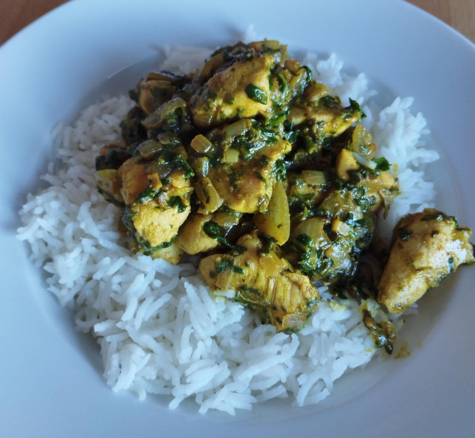 Spinat waschen. Zwiebel, Ingwer und Knoblauch schälen. Zwiebel würfeln, Ingwer und Knoblauch hacken. Fleisch herausnehmen. 1 EL Öl und Butter im Bratfett erhitzen. Zwiebel, Ingwer und Knoblauch darin andünsten. Curry darin kurz anschwitzen. Spinat zufügen, zugedeckt zusammenfallen lassen. Mit Zitronensaft, Salz und Pfeffer abschmecken.